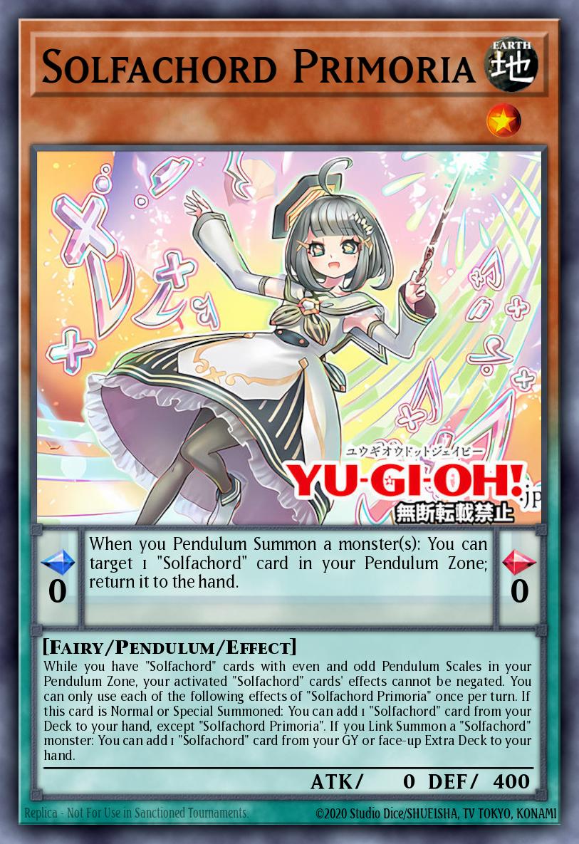 While you have "Solfachord" cards with even and odd Pendulum Scales in your Pendulum Zone, your activated "Solfachord" cards' effects cannot be negated. You can only use each of the following effects of "Solfachord Primoria" once per turn. If this card is Normal or Special Summoned: You can add 1 "Solfachord" card from your Deck to your hand, except "Solfachord Primoria". If you Link Summon a "Solfachord" monster: You can add 1 "Solfachord" card from your GY or face-up Extra Deck to your hand.