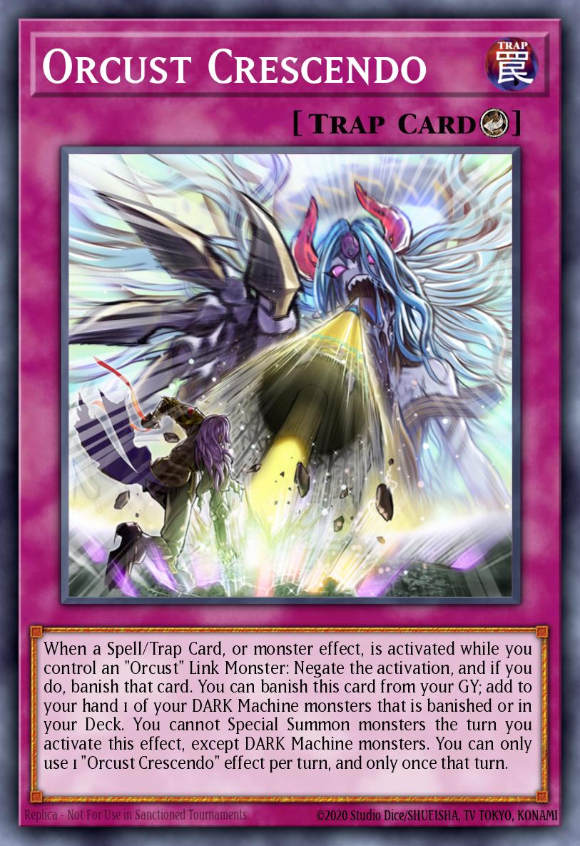Card Details: When a Spell/Trap Card, or monster effect, is activated while you control an "Orcust" Link Monster: Negate the activation, and if you do, banish that card. You can banish this card from your GY; add to your hand 1 of your DARK Machine monsters that is banished or in your Deck. You cannot Special Summon monsters the turn you activate this effect, except DARK Machine monsters. You can only use 1 "Orcust Crescendo" effect per turn, and only once that turn.
