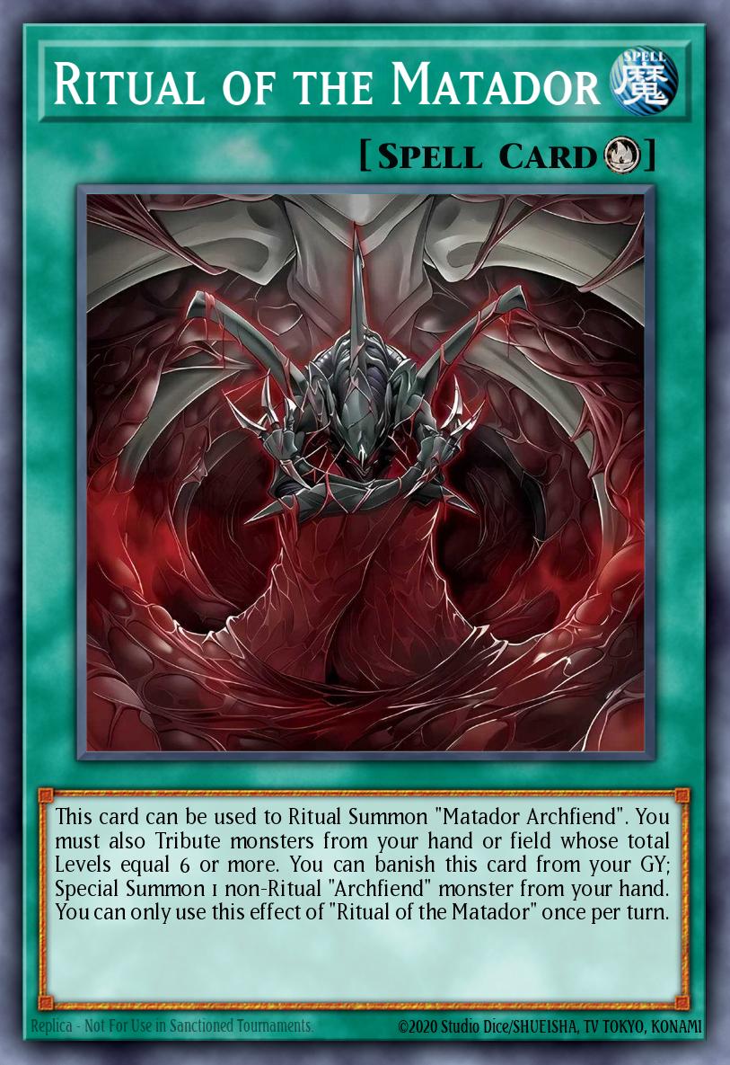 Card Details: This card can be used to Ritual Summon "Matador Archfiend". You must also Tribute monsters from your hand or field whose total Levels equal 6 or more. You can banish this card from your GY; Special Summon 1 non-Ritual "Archfiend" monster from your hand. You can only use this effect of "Ritual of the Matador" once per turn.