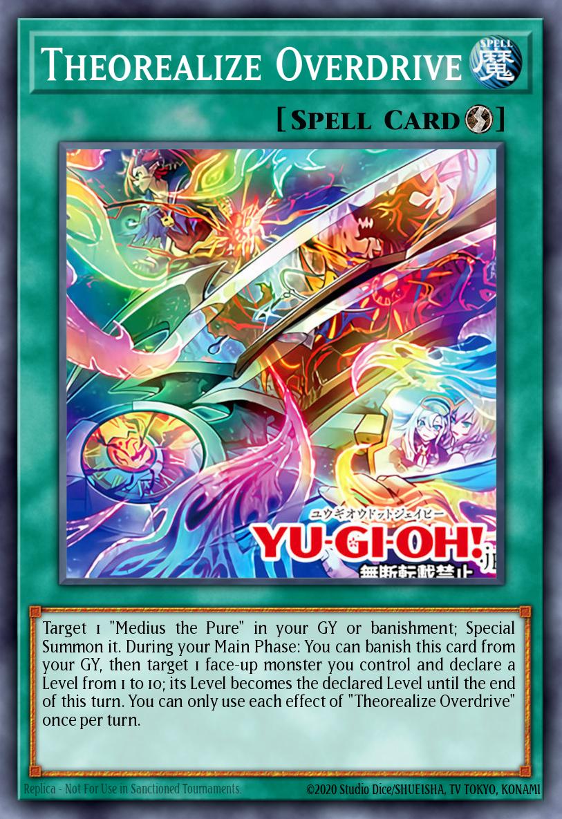 Target 1 "Medius the Pure" in your GY or banishment; Special Summon it. During your Main Phase: You can banish this card from your GY, then target 1 face-up monster you control and declare a Level from 1 to 10; its Level becomes the declared Level until the end of this turn. You can only use each effect of "Theorealize Overdrive" once per turn.