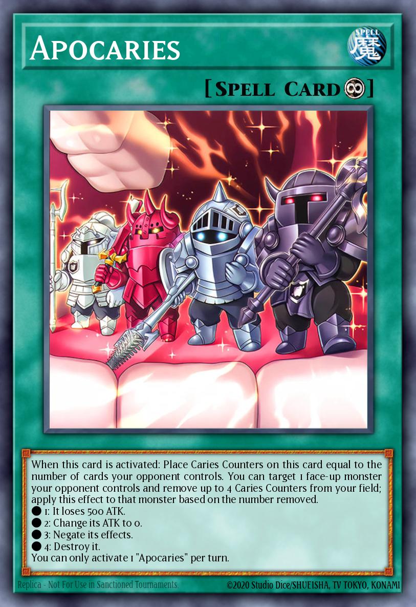 When this card is activated: Place Caries Counters on this card equal to the number of cards your opponent controls. You can target 1 face-up monster your opponent controls and remove up to 4 Caries Counters from your field; apply this effect to that monster based on the number removed.