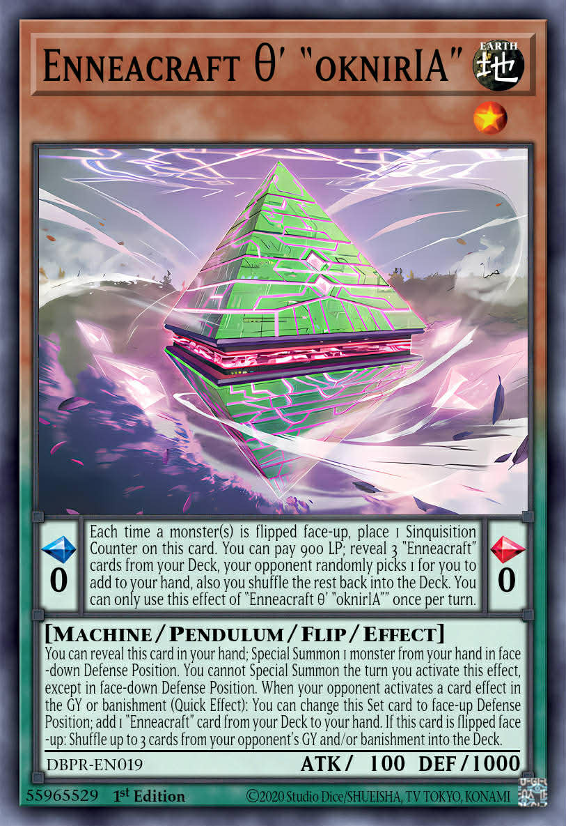 Card Details: [ Pendulum Effect ] Each time a monster(s) is flipped face-up, place 1 Sinquisition Counter on this card. You can pay 900 LP; reveal 3 "Enneacraft" cards from your Deck, your opponent randomly picks 1 for you to add to your hand, also you shuffle the rest back into the Deck. You can only use this effect of "Enneacraft θ' "oknirIA"" once per turn. [ Monster Effect ] FLIP: Shuffle up to 3 cards from your opponent's GY and/or banishment into the Deck. You can reveal this card in your hand; Special Summon 1 monster from your hand in face-down Defense Position. You cannot Special Summon the turn you activate this effect, except in face-down Defense Position. When your opponent activates a card effect in the GY or banishment (Quick Effect): You can change this Set card to face-up Defense Position; add 1 "Enneacraft" card from your Deck to your hand.